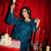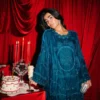 Twinkle is crafted from rich teal velvet, featuring delicate scalloped details and intricate tonal embroidery. Its soft texture and refined silhouette make it an elegant choice for winter festivities.