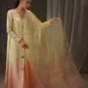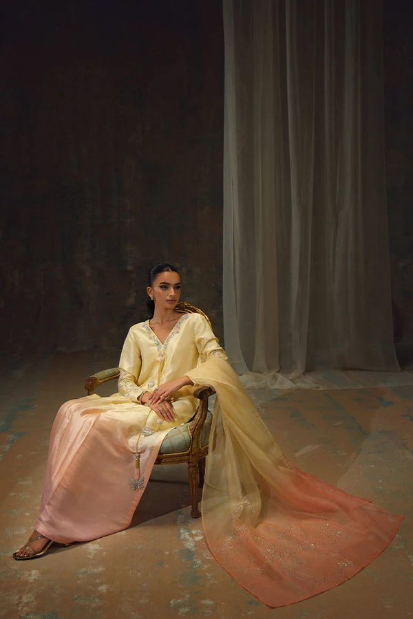 This Ombre silk ensemble captures the quiet magic of starlight meeting daybreak. Hand-embroidered in delicate tilla and resham, its neckline and sleeves glisten with intricate floral motifs, while cascading crystal-beaded tassels adorned with jeweled butterflies add a playful yet refined sparkle. The cut features a softly flared hemline for fluid movement and an effortlessly regal fall. The ombré gradient, fading from a gentle buttercream to a blush peach, mirrors the first light of morning. Paired with wide-leg pants and an organza dupatta sequined with fluttering butterflies, it’s a festive statement for those who wish to shimmer with subtle grace.