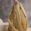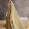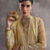 - Lemon yellow organza, four-sided embroidery with wide scallops, floral patterns, and bold motifs with pink and green patchwork