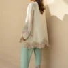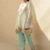Softly sculpted in self embossed ivory khaddi corduroy, this ensemble features sorbet hued aari embroidery and delicate zari accents, making it an artisanal masterpiece. The hem and sleeves are finished with scalloped embroidery that echoes the tonal subtlety of the piece. It is paired with a fluid pure rawsilk shalwar in a seafoam tone, detailed with embellishment along the hem.