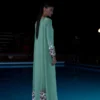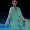A graceful apple green grip shirt featuring a delicate U-shaped neckline adorned with a subtle fabric tassel. The full sleeves are intricately embellished with shimmering gold metallic coins and gradient green sitara, adding a subtle spark. The look is completed with a chiffon dupatta, echoing the same embellishments and finished with long, flowing tassels for a cohesive and elegant touch.