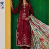 The printed dupatta complements the look with layered patterns and deeper tonal variations, enhancing the richness of the palette while adding fluidity and movement. Paired with coordinated trousers featuring subtle border detailing, the ensemble feels powerful yet graceful.