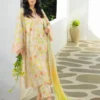 Light and serene in mood, an aqua jacquard lawn shirt is adorned with botanical embroidery in a soft pastel palette, accented by eyelet detailing along the neckline and front. A scalloped embroidered hem lends a refined finish. The ensemble is paired with a matching jacquard lawn shalwar, finished with fine embroidery along the hem. A printed medium silk dupatta completes the look, showcasing a scenic floral composition in shades of pistachio, celadon, and soft blush, finished with whimsical English garden motifs at either end.