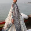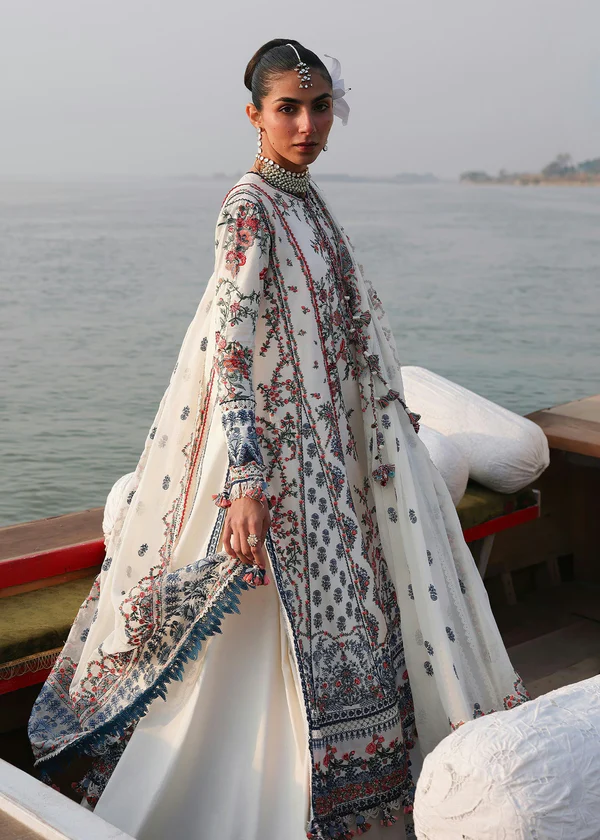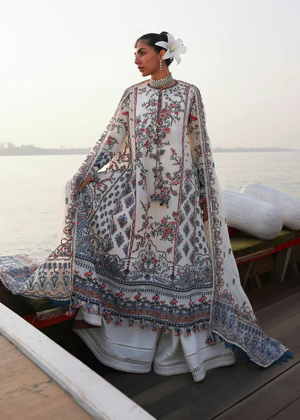 An exquisite summer ensemble crafted from luxurious off-white lawn fabric, featuring intricate red and navy blue floral embroidery with delicate geometric accents. Paired with a richly embellished chiffon dupatta with coordinated border traditional craftsmanship with modern summer elegance for a sophisticated, detail‑oriented look.