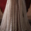 - A white organza pishwaas with scoop neckline, fitted cap sleeves, self-embroidery with beads, mirrors, and pearls, scalloped hem, tasselled back, and layered cutwork finish.