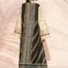 This luminescent tan ensemble carries an ethereal glow, featuring an A line pure rawsilk shirt adorned with tonal embroidery depicting a lush, whimsical forest scene across the front. The back reveals a striking ebony hued geometric print, introducing a contemporary contrast. Framed by a V neckline, the design is further elevated with wide statement sleeves detailed with delicate organza panels. It is paired with ebony toned culottes finished with printed detailing, grounding the look with a balanced, modern finish.