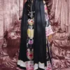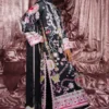 A timeless black long shirt elevated with an embellished neckline, delicately finished with bow details for a touch of understated glamour. Intricate lace detailing adds depth and refinement to the silhouette, enhancing its elegant appeal. Paired with a medium silk dupatta featuring a printed border and lace accents, the look is completed with luxurious sheesha silk pants adorned with subtle lace detailing. A classic ensemble that blends sophistication with modern femininity.
