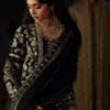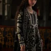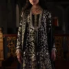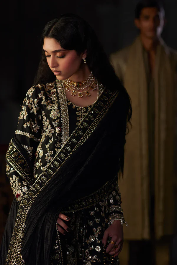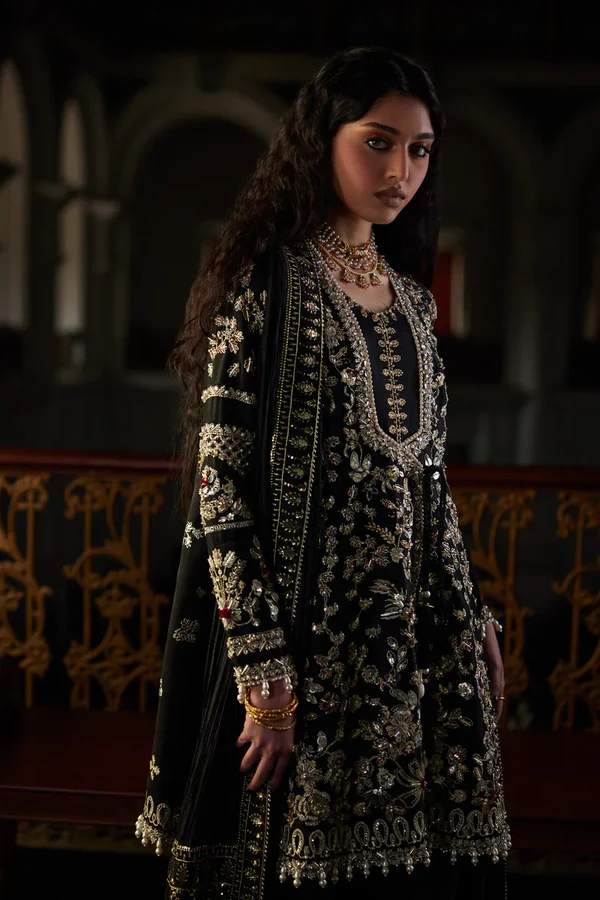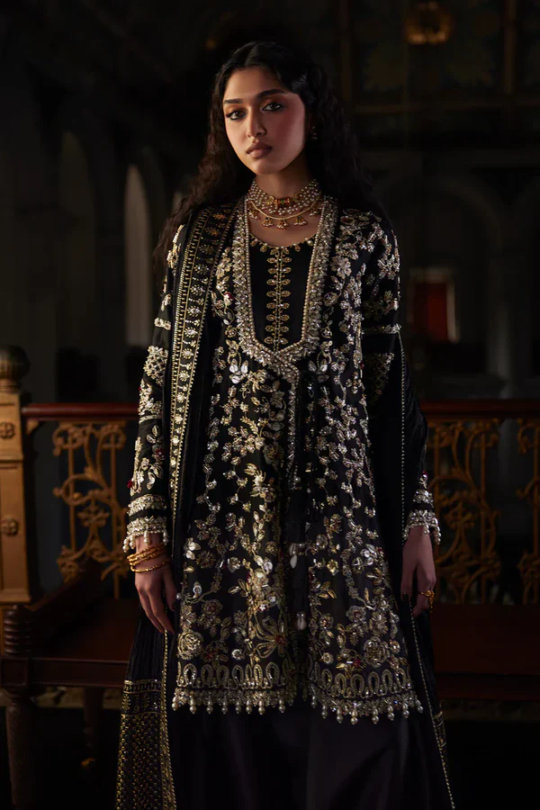 This stylish short black angrakha shirt features exquisite handwork, showcasing intricate zardozi and cutdana embellishments that add a touch of elegance. The shirt is paired with a matching shalwar, creating a sophisticated silhouette. Completing the look is a beautifully embroidered crush dupatta, adorned with sequined pallu details, elevating the ensemble to a statement piece suitable for any special occasion.
