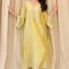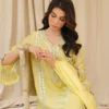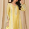 Bathed in the soft glow of lemon, Ziya is crafted from luminous zari net and adorned with exquisite hand-embroidered gota patti work. The delicate embellishments shimmer against the airy fabric, creating a timeless silhouette that moves with effortless grace. Can be Paired with a flowing medium silk dupatta and comes with tonal straight pants, this ensemble is the perfect expression of festive charm—fresh, feminine, and unapologetically elegant.